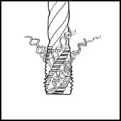 På grunn av spiralpunktet blir spon rullet sammen i skjæreretningen, noe som forhindrer «pakking» av spon. Kjølevæske/skjæreolje kan flyte fritt. |