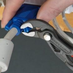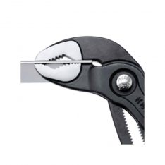 KNIPEX-«Cobra» – HiTech vannpumpetang. Slutt på omstendelig utprøving av riktig åpningsvidde. I stedet legges øvre kjevedel på arbeidsstykker, trykk på knappen og skyv til nedre bakke – genialt enkelt.