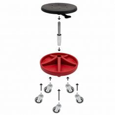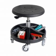 Robust taburett til industrien eller verkstedet med bekvemt sete i PU-skum og trinnløs innstilling av setevinkel. Velegnet til arbeid hvor man eksempelvis må sitte på huk, på kne eller stå foroverbøyd. Fast fotkryss i rødt eller svart med 5 rom, som gir mulighet for oppbevaring av bolter, skruer, verktøy m.m.