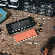 Work Sharp WHT våtslipestein er et slipesteinsystem med to korninger vannslipesstein, og vinkeljigger for sliping av kniver og annet «eggverktøy»